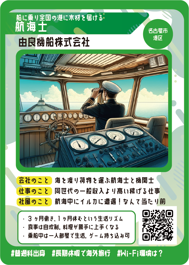 名古屋、大阪、広島、茨城、千葉など国内の港をまわる内航海運事業を行っています。船の上で働くには「海技士」という免許が必要です。以前は取得するのに数年かかりましたが、現在では普通科高校の生徒でも最短10.5ヶ月で取得できるようになりました。3ヶ月間仲間と共に大自然を旅するという、他に類を見ない仕事。実は多くの人に門戸が開かれている、誰でも目指すことができる仕事なのです。